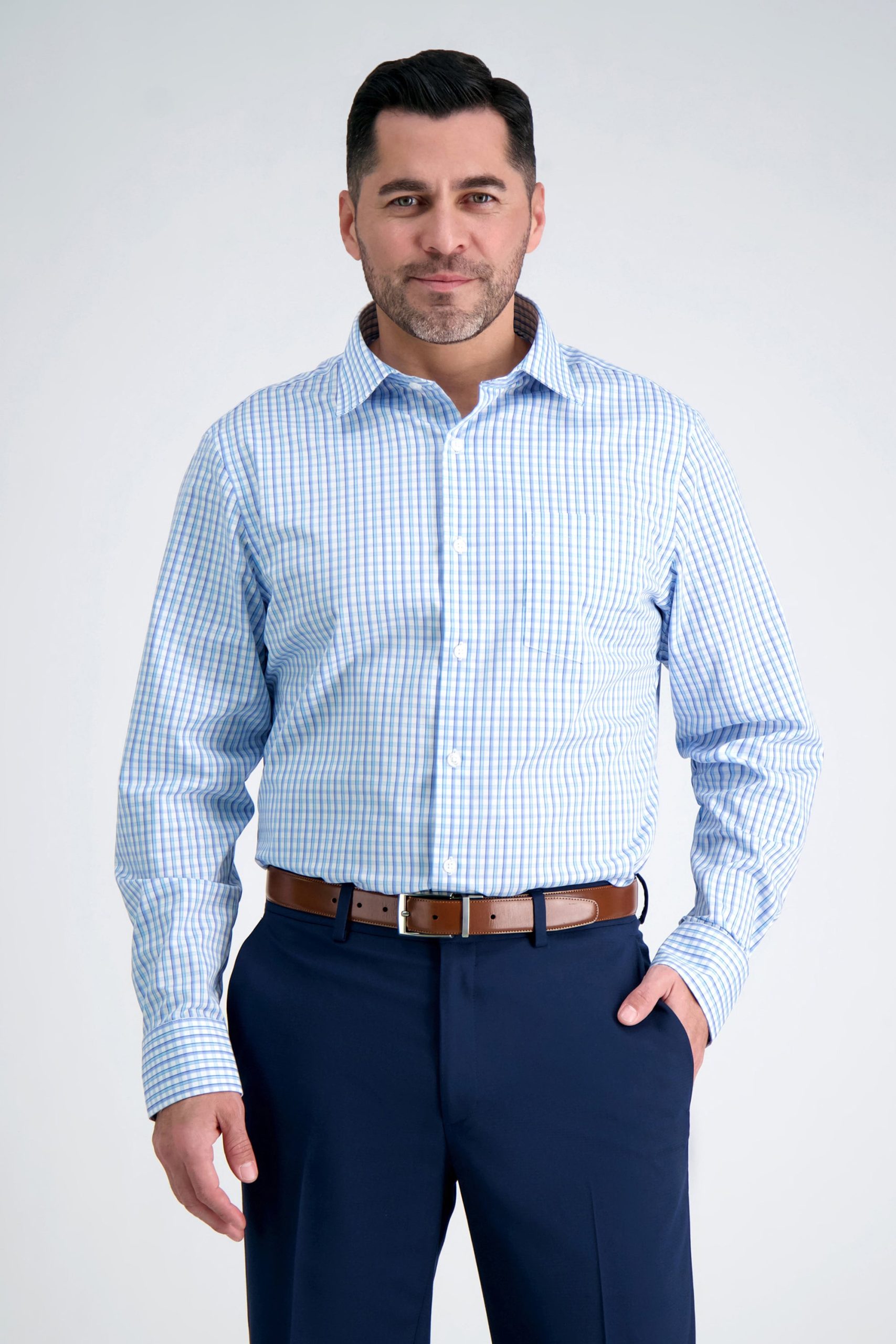 Our Premium Comfort dress shirt is the perfect combination of comfort and style. Its design features a spread and motion ease collar, wide chest pocket, and buttoned barrel cuffs. Wrinkle-free, cotton-blend stretch fabric keeps your look crisp throughout the day.